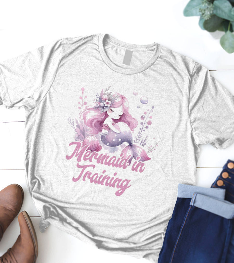 Mermaid in Training Customizable Kids Mermain Shirt made from 100% pre-shrunk ring-spun cotton, unisex regular fit based on U.S. standard sizing. The shirt is designed, cut, sewn, and printed in the United States. Available in sizes S-5XL.