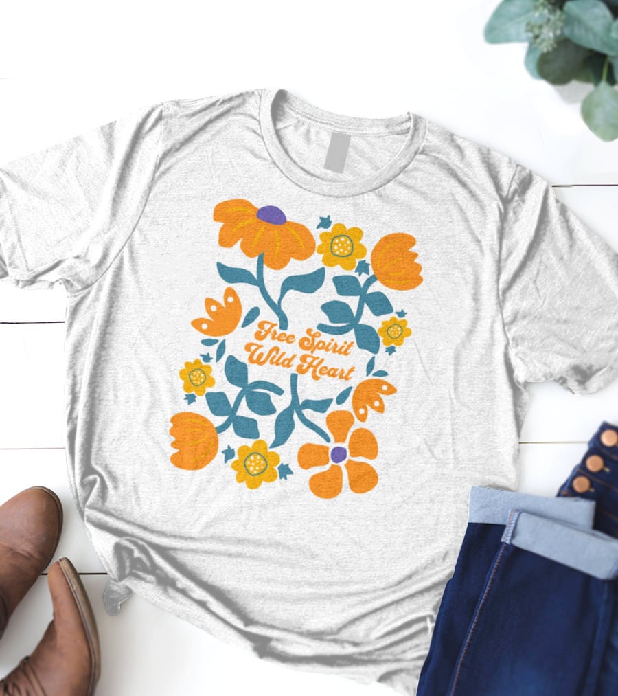 Free Spirit Wild Heart Floral Shirt made from 100% pre-shrunk ring-spun cotton, unisex regular fit based on U.S. standard sizing. The shirt is designed, cut, sewn, and printed in the United States. Available in sizes S-5XL.