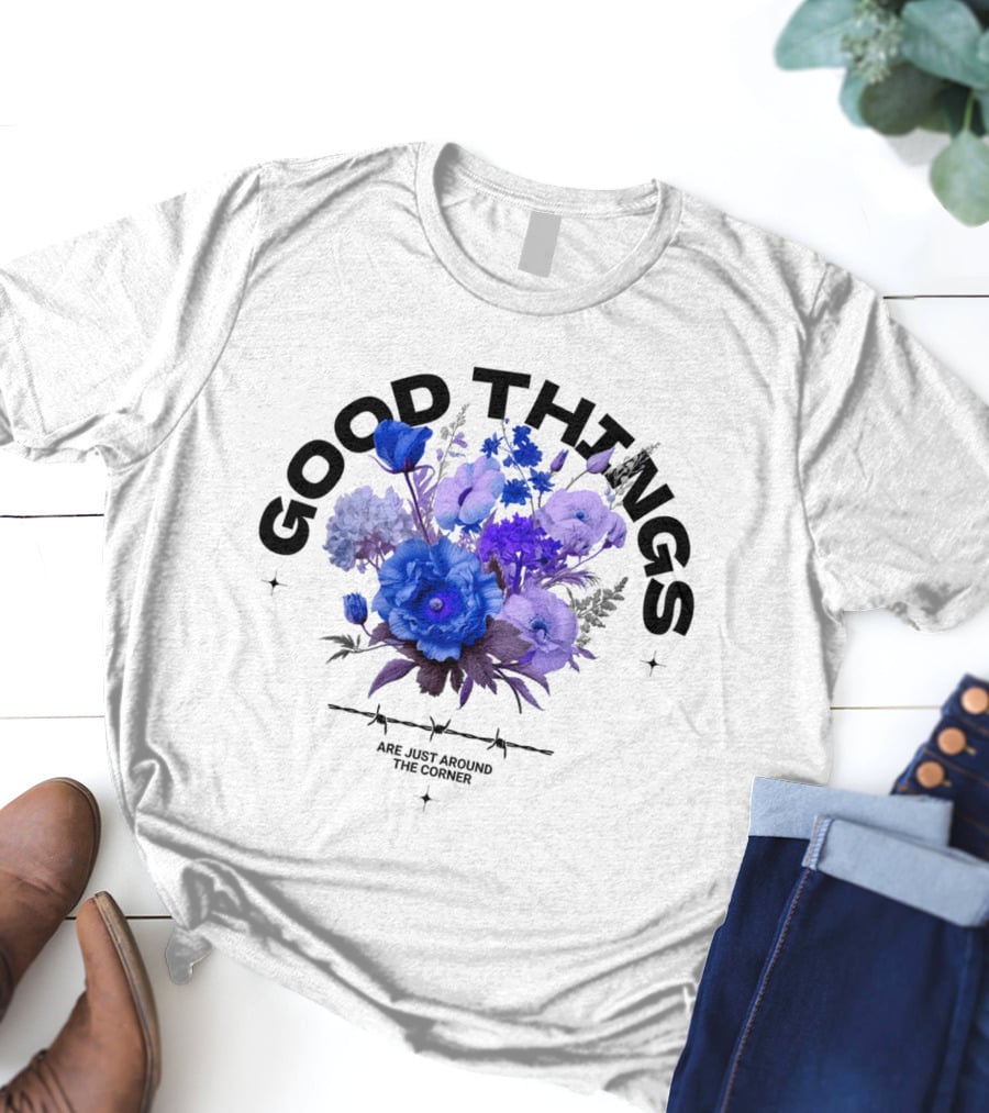 Good Things Are Just Around the Corner Shirt made from 100% pre-shrunk ring-spun cotton, unisex regular fit based on U.S. standard sizing. The shirt is designed, cut, sewn, and printed in the United States. Available in sizes S-5XL.