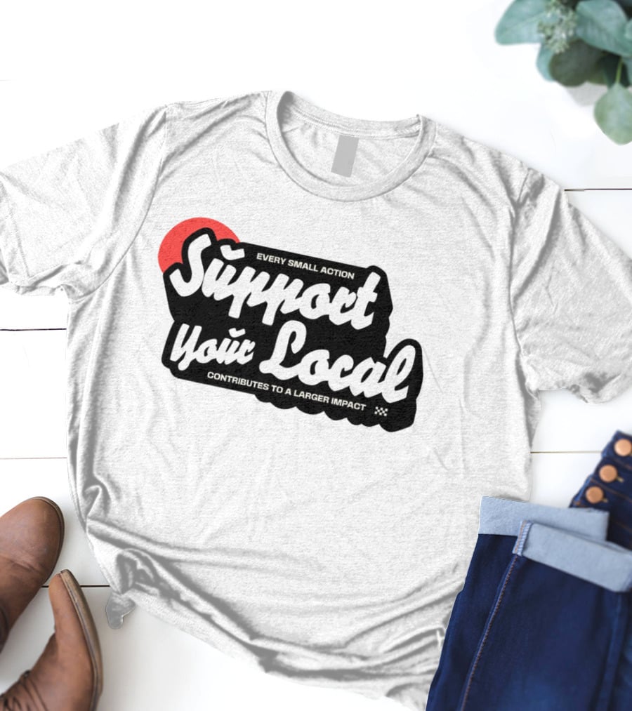 Every Small Action Support Your Local Contributes to a Larger Impact Shirt made from 100% pre-shrunk ring-spun cotton, unisex regular fit based on U.S. standard sizing. The shirt is designed, cut, sewn, and printed in the United States. Available in sizes S-5XL.