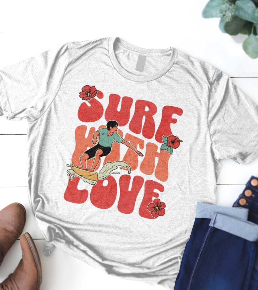 Surf With Love Hibiscus Wave Rider Shirt made from 100% pre-shrunk ring-spun cotton, unisex regular fit based on U.S. standard sizing. The shirt is designed, cut, sewn, and printed in the United States. Available in sizes S-5XL.