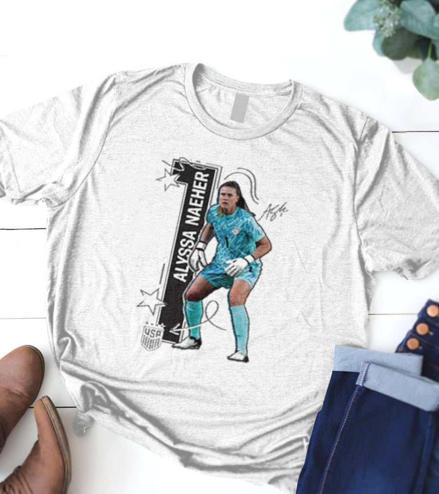 USWNT Alyssa Naeher Number One Star Keeper Signature Shirt made from 100% pre-shrunk ring-spun cotton, unisex regular fit based on U.S. standard sizing. The shirt is designed, cut, sewn, and printed in the United States. Available in sizes S-5XL.