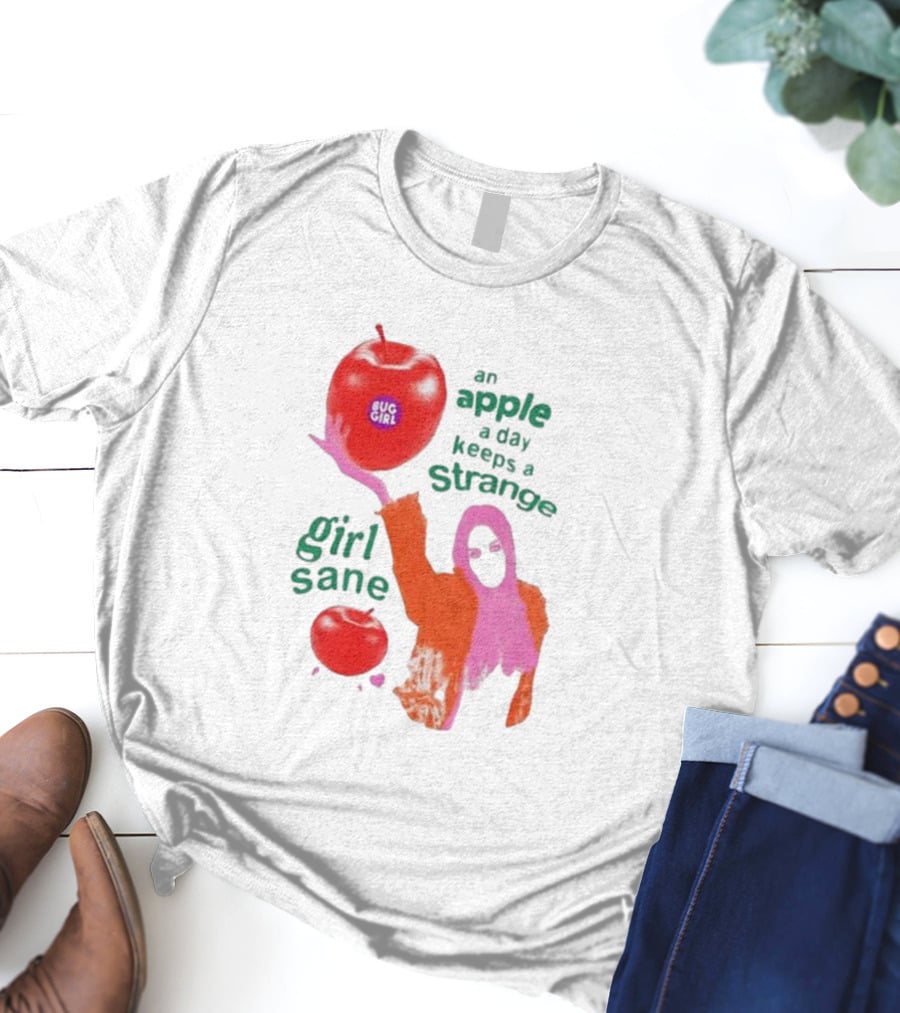 An Apple A Day Keeps A Strange Girl Sane Bug Girl Shirt made from 100% pre-shrunk ring-spun cotton, unisex regular fit based on U.S. standard sizing. The shirt is designed, cut, sewn, and printed in the United States. Available in sizes S-5XL.