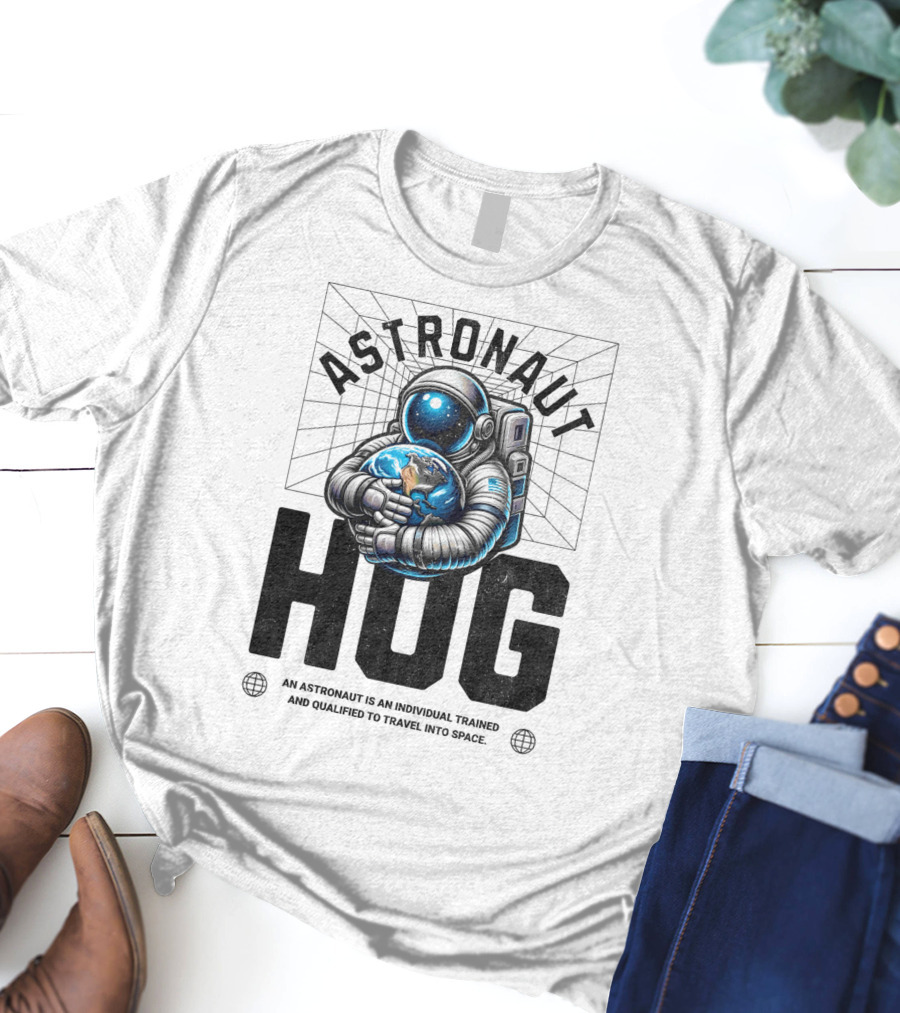 Astronaut Hug Earth Embrace Space Travel Qualification Shirt made from 100% pre-shrunk ring-spun cotton, unisex regular fit based on U.S. standard sizing. The shirt is designed, cut, sewn, and printed in the United States. Available in sizes S-5XL.