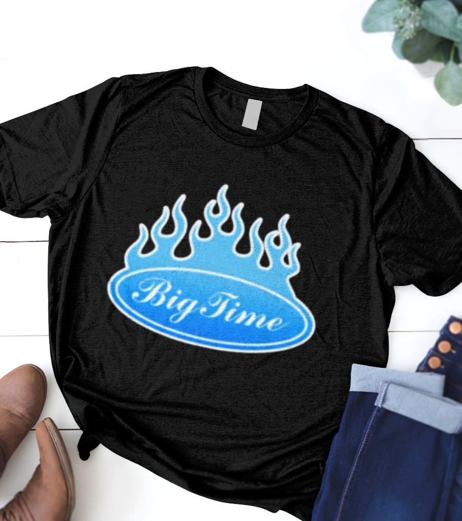 Big Time Blue Flame Oval Emblem Shirt made from 100% pre-shrunk ring-spun cotton, unisex regular fit based on U.S. standard sizing. The shirt is designed, cut, sewn, and printed in the United States. Available in sizes S-5XL.
