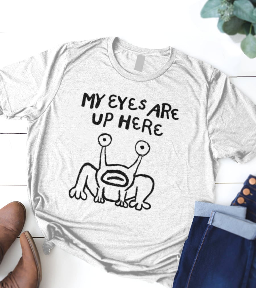 Daniel Johnston Frog My Eyes Are Up Here Drawing Shirt made from 100% pre-shrunk ring-spun cotton, unisex regular fit based on U.S. standard sizing. The shirt is designed, cut, sewn, and printed in the United States. Available in sizes S-5XL.