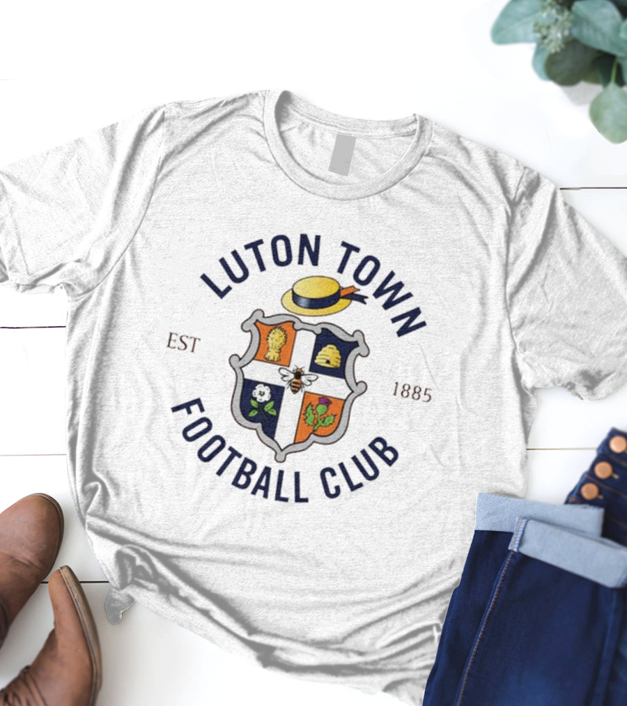 Luton Town Football Club Est 1885 Badge with Hat, Wheat, Beehive, Rose, and Bee Shirt made from 100% pre-shrunk ring-spun cotton, unisex regular fit based on U.S. standard sizing. The shirt is designed, cut, sewn, and printed in the United States. Available in sizes S-5XL.