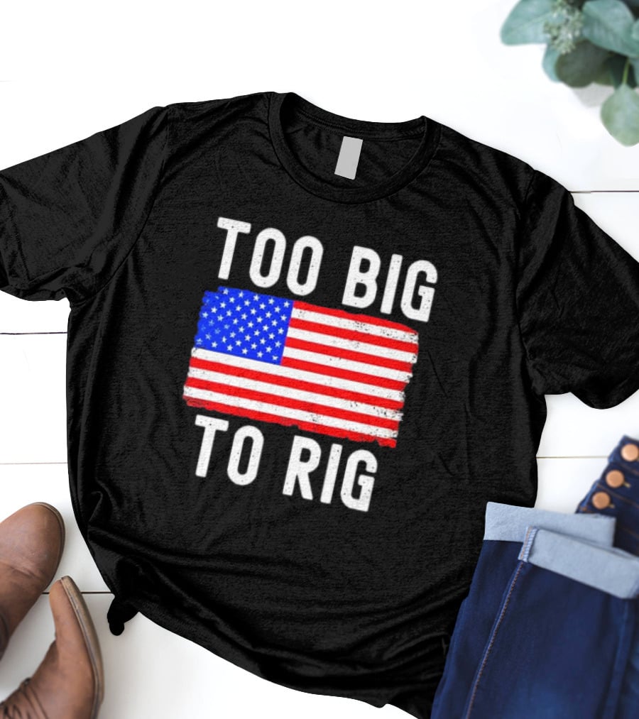 Too Big To Rig American Flag Patriotic Shirt made from 100% pre-shrunk ring-spun cotton, unisex regular fit based on U.S. standard sizing. The shirt is designed, cut, sewn, and printed in the United States. Available in sizes S-5XL.