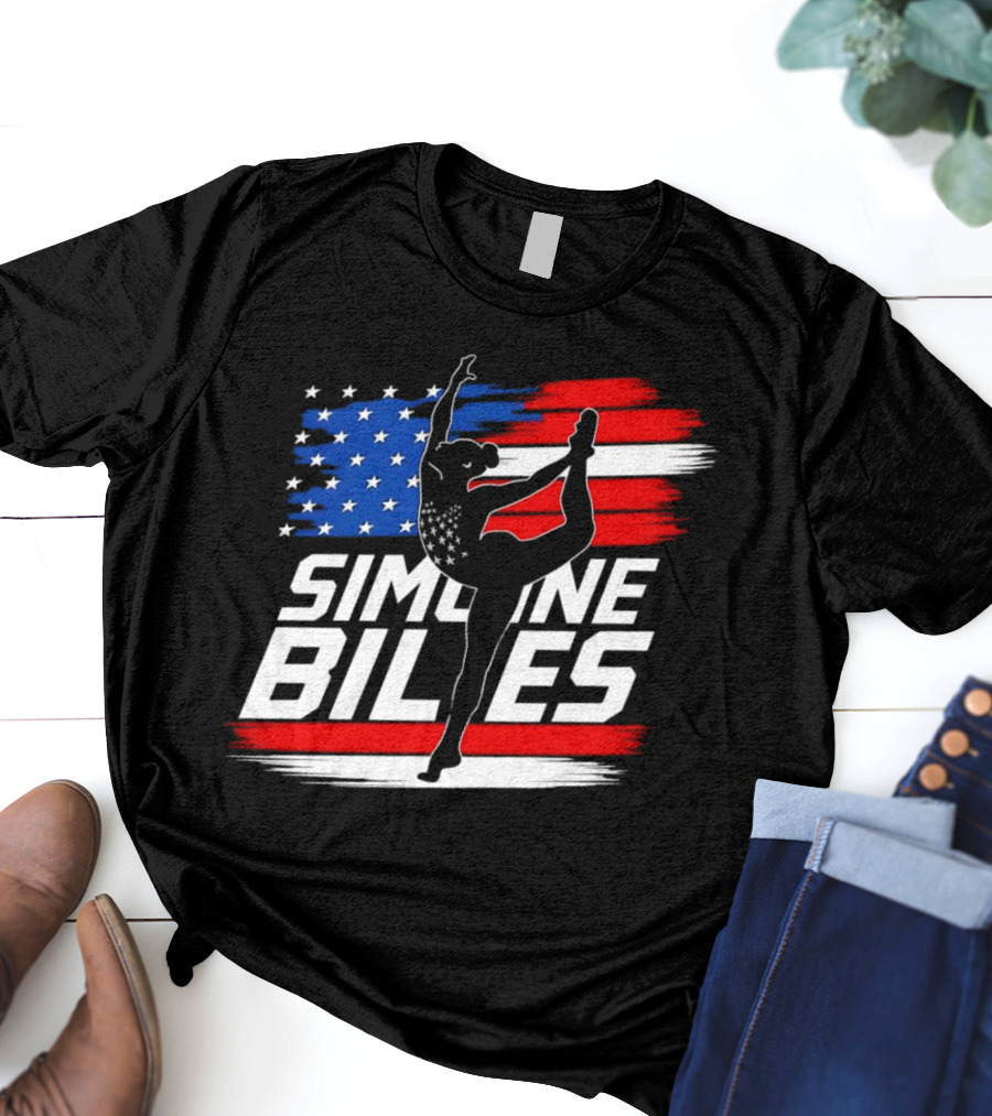 SIMONE BILES USA AMERICAN FLAG GYMNASTICS TEAM Shirt made from 100% pre-shrunk ring-spun cotton, unisex regular fit based on U.S. standard sizing. The shirt is designed, cut, sewn, and printed in the United States. Available in sizes S-5XL.