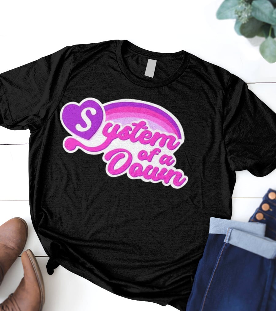 System of a Down Rainbow Heart Shirt made from 100% pre-shrunk ring-spun cotton, unisex regular fit based on U.S. standard sizing. The shirt is designed, cut, sewn, and printed in the United States. Available in sizes S-5XL.