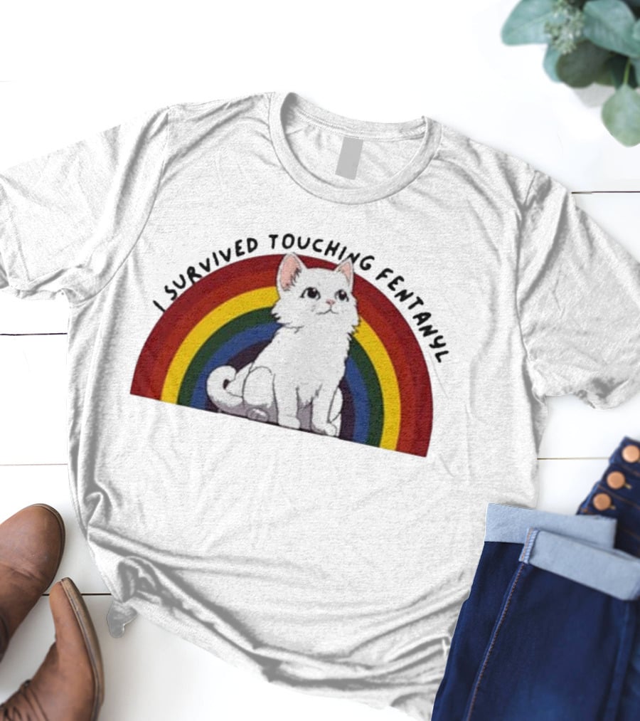 Naomi I Survived Touching Fentanyl Cat Shirt made from 100% pre-shrunk ring-spun cotton, unisex regular fit based on U.S. standard sizing. The shirt is designed, cut, sewn, and printed in the United States. Available in sizes S-5XL.