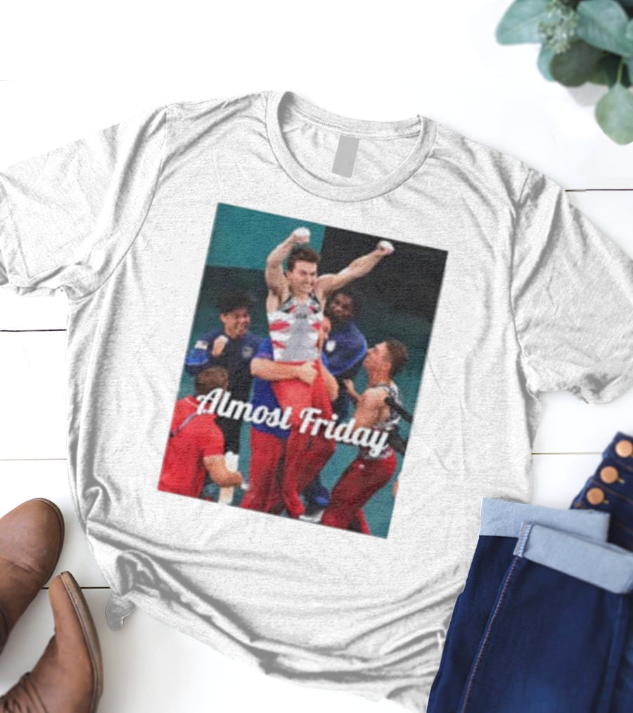 Paul Juda Celebratory Almost Friday Olympic Kid Shirt made from 100% pre-shrunk ring-spun cotton, unisex regular fit based on U.S. standard sizing. The shirt is designed, cut, sewn, and printed in the United States. Available in sizes S-5XL.