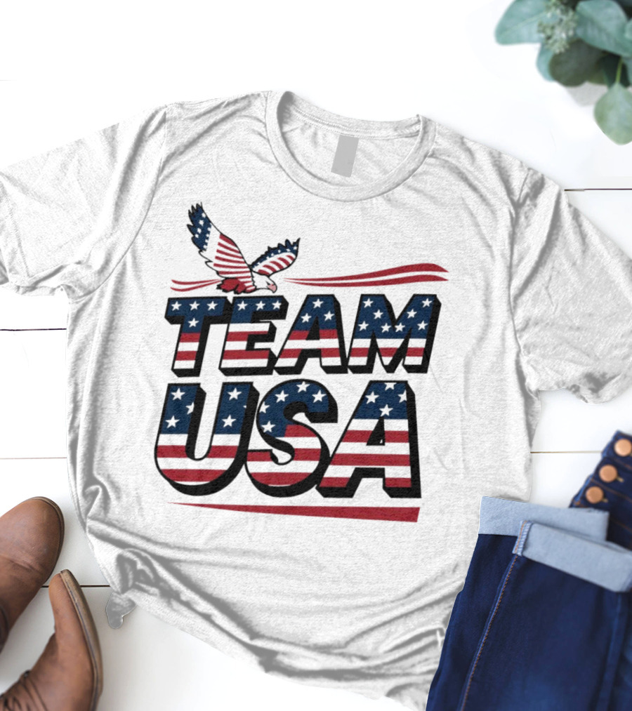 Team USA Eagle Flag Patriotic Shirt made from 100% pre-shrunk ring-spun cotton, unisex regular fit based on U.S. standard sizing. The shirt is designed, cut, sewn, and printed in the United States. Available in sizes S-5XL.