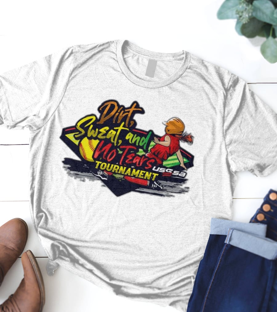 USSSA Texas Dirt Sweat and No Tears Tournament Shirt made from 100% pre-shrunk ring-spun cotton, unisex regular fit based on U.S. standard sizing. The shirt is designed, cut, sewn, and printed in the United States. Available in sizes S-5XL.