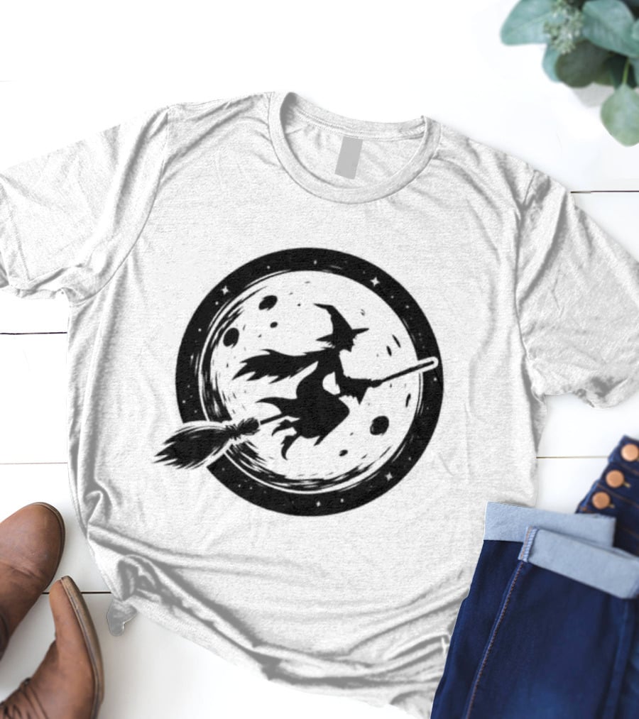 Spooky Halloween Witch Flying Across Full Moon Night Shirt made from 100% pre-shrunk ring-spun cotton, unisex regular fit based on U.S. standard sizing. The shirt is designed, cut, sewn, and printed in the United States. Available in sizes S-5XL.