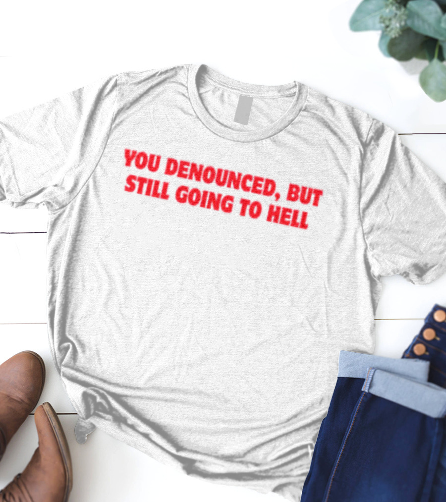 You Denounced But Still Going To Hell Shirt made from 100% pre-shrunk ring-spun cotton, unisex regular fit based on U.S. standard sizing. The shirt is designed, cut, sewn, and printed in the United States. Available in sizes S-5XL.