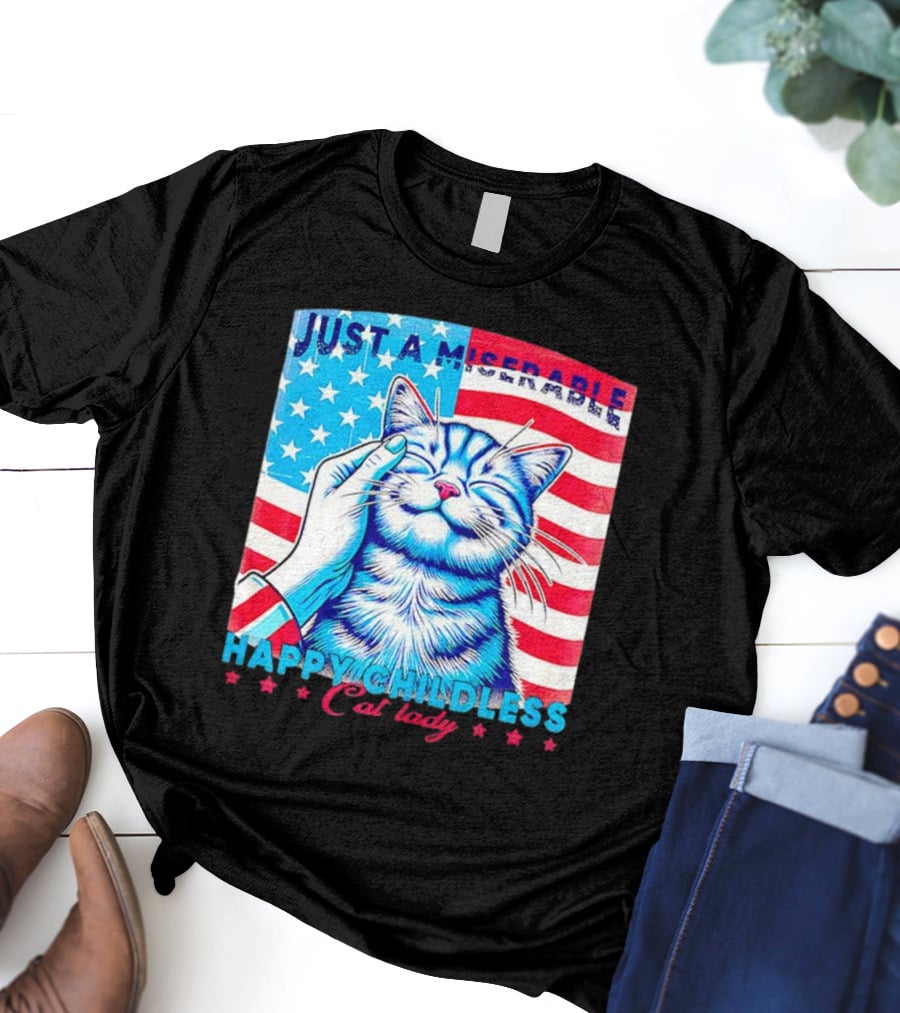 Just a Miserable Happy Childless Cat Lady Patriotic Flag Background Shirt made from 100% pre-shrunk ring-spun cotton, unisex regular fit based on U.S. standard sizing. The shirt is designed, cut, sewn, and printed in the United States. Available in sizes S-5XL.