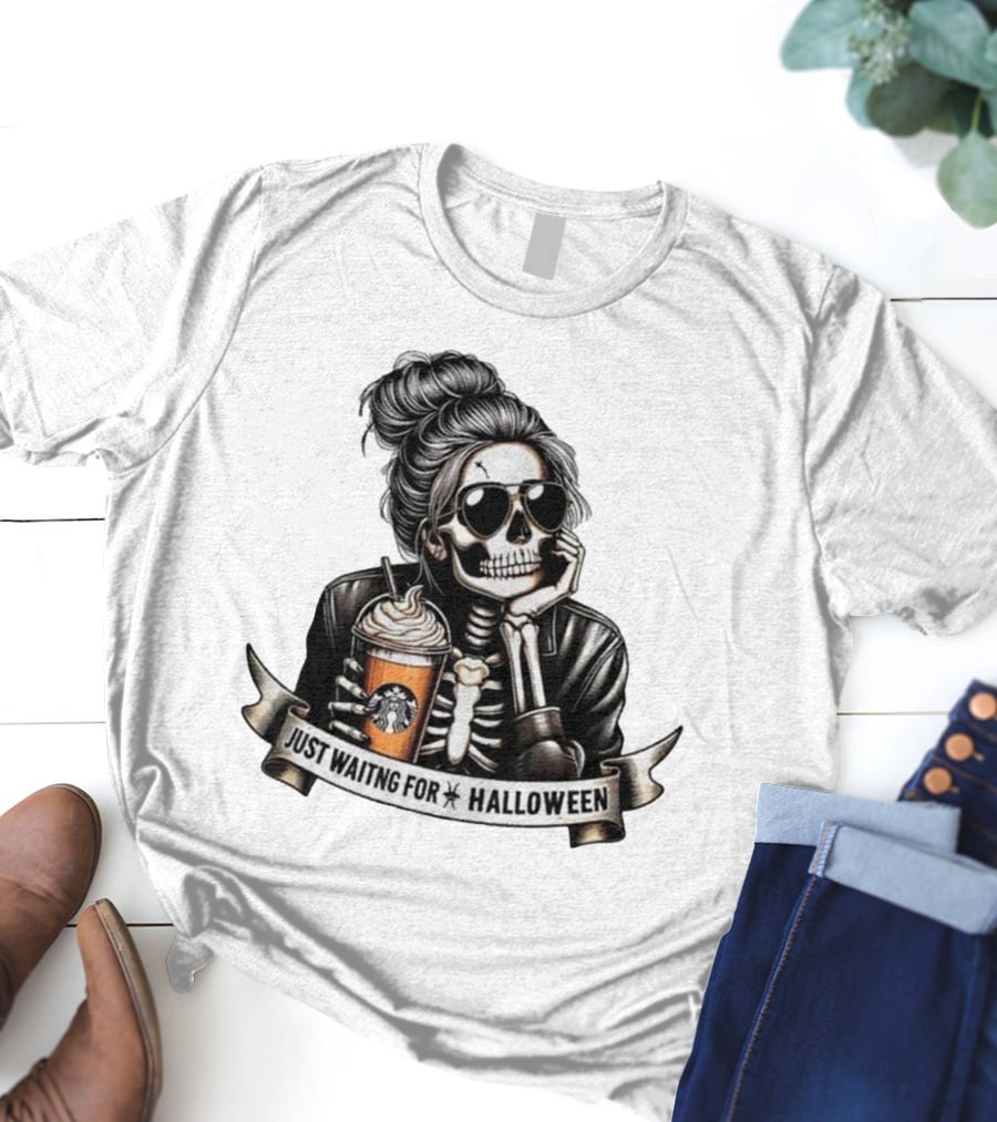 Just Waiting For Halloween Skeleton With Coffee Cup Spooky Season Shirt made from 100% pre-shrunk ring-spun cotton, unisex regular fit based on U.S. standard sizing. The shirt is designed, cut, sewn, and printed in the United States. Available in sizes S-5XL.