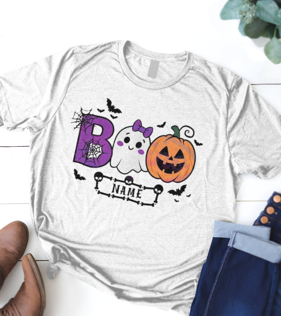 Boo Name Ghost Pumpkin Halloween Spiders Bats Shirt made from 100% pre-shrunk ring-spun cotton, unisex regular fit based on U.S. standard sizing. The shirt is designed, cut, sewn, and printed in the United States. Available in sizes S-5XL.