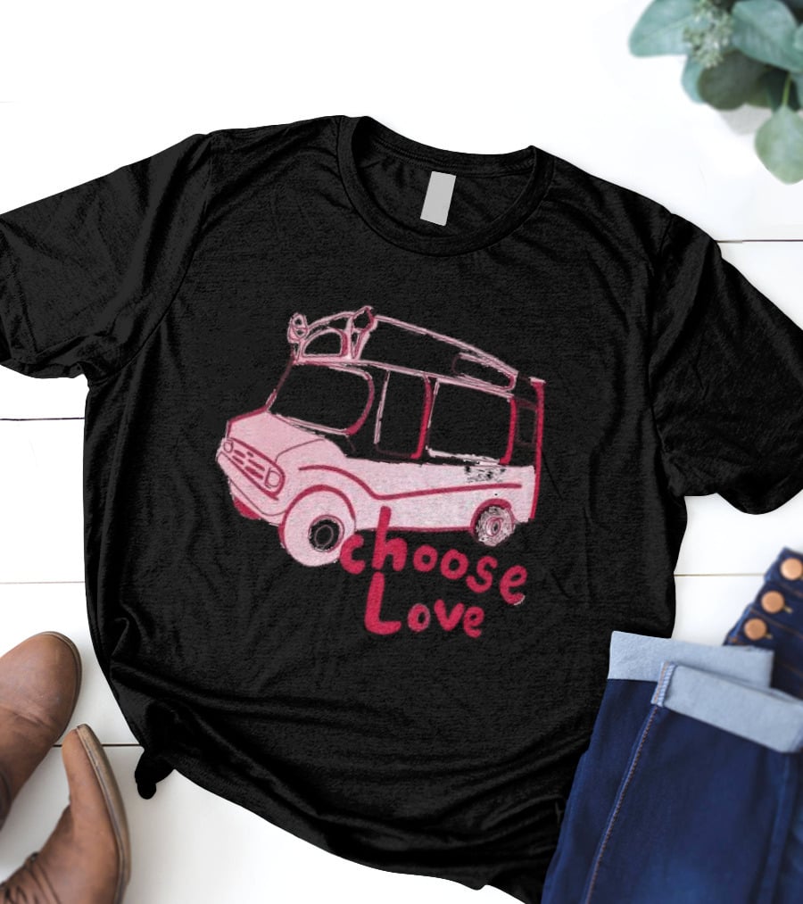 Choose Love Ice Cream Van Shirt made from 100% pre-shrunk ring-spun cotton, unisex regular fit based on U.S. standard sizing. The shirt is designed, cut, sewn, and printed in the United States. Available in sizes S-5XL.