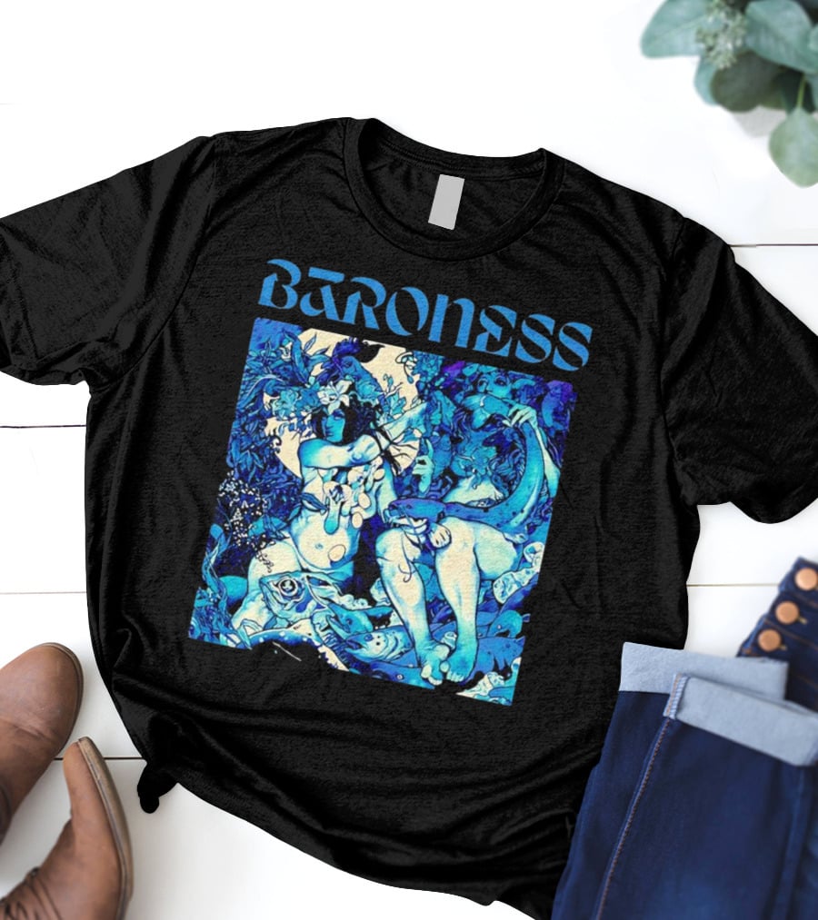 Baroness Blue Record Psychedelic Mythical Scene Shirt made from 100% pre-shrunk ring-spun cotton, unisex regular fit based on U.S. standard sizing. The shirt is designed, cut, sewn, and printed in the United States. Available in sizes S-5XL.