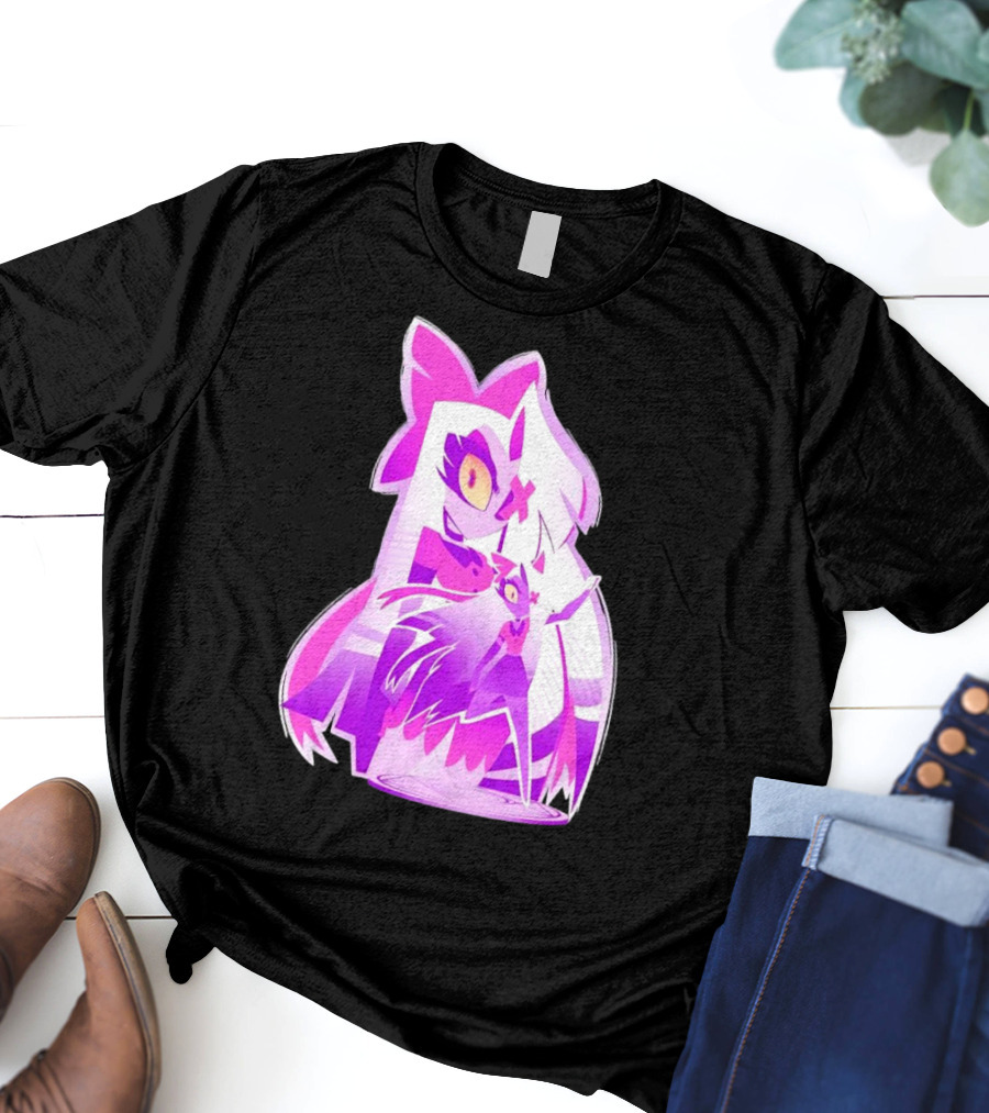 Exorcist Angel Hazbin Hotel Game Purple Character Shirt made from 100% pre-shrunk ring-spun cotton, unisex regular fit based on U.S. standard sizing. The shirt is designed, cut, sewn, and printed in the United States. Available in sizes S-5XL.