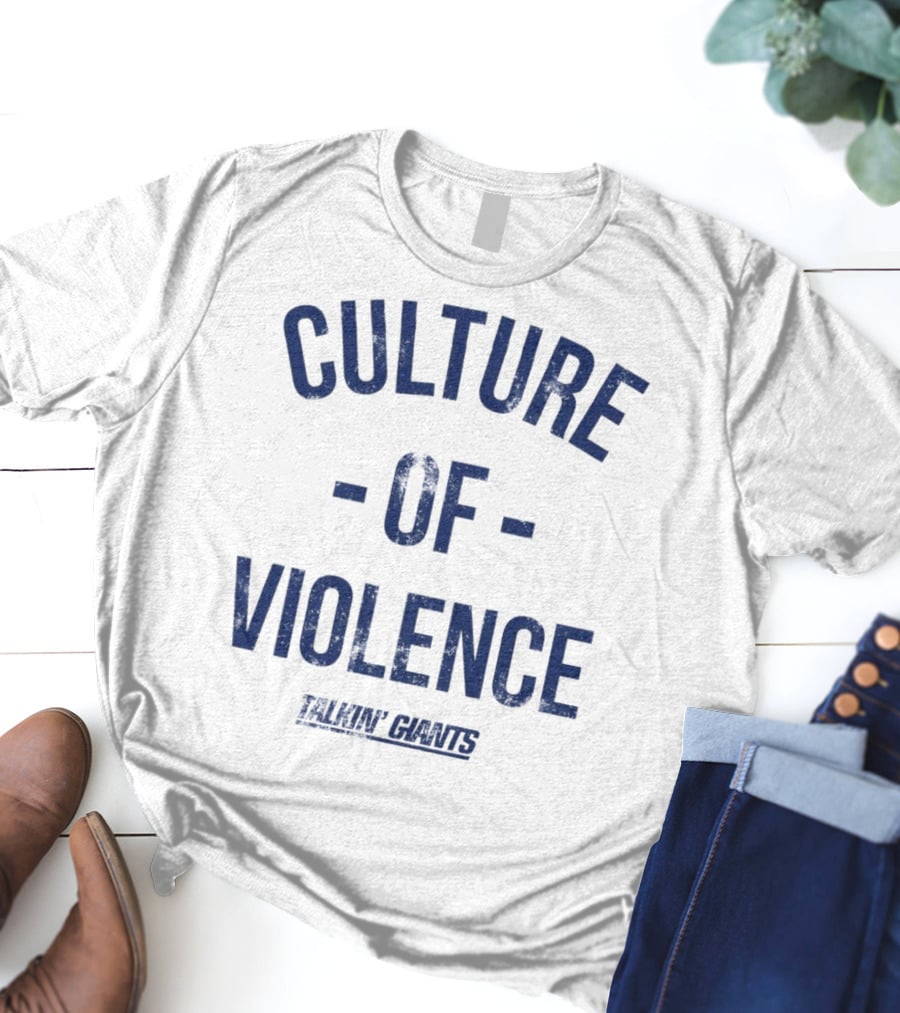Talkin’ Giants Culture of Violence Shirt made from 100% pre-shrunk ring-spun cotton, unisex regular fit based on U.S. standard sizing. The shirt is designed, cut, sewn, and printed in the United States. Available in sizes S-5XL.