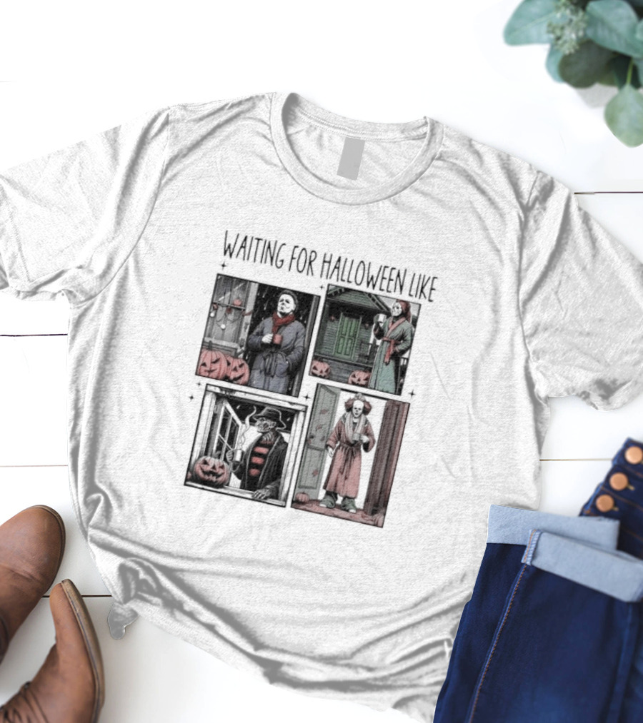 Waiting For Halloween Like Horror Movie Characters with Pumpkins and Costumes Shirt made from 100% pre-shrunk ring-spun cotton, unisex regular fit based on U.S. standard sizing. The shirt is designed, cut, sewn, and printed in the United States. Available in sizes S-5XL.