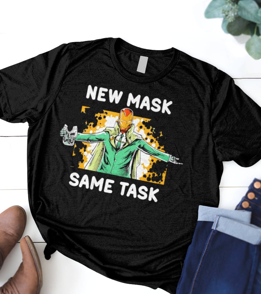 New Mask Same Task Doctor Doom Iron Man Shirt made from 100% pre-shrunk ring-spun cotton, unisex regular fit based on U.S. standard sizing. The shirt is designed, cut, sewn, and printed in the United States. Available in sizes S-5XL.