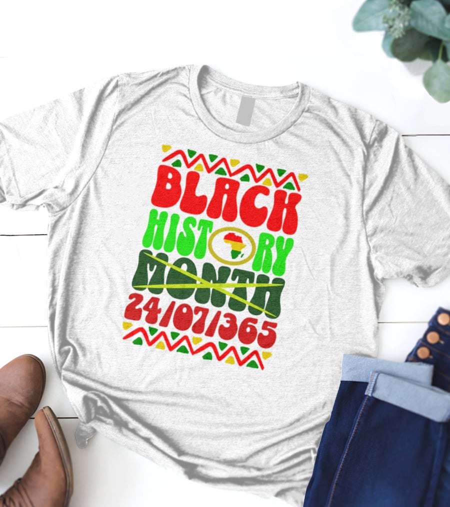 BLACK HISTORY MONTH AFRICA 24/07/365 Shirt made from 100% pre-shrunk ring-spun cotton, unisex regular fit based on U.S. standard sizing. The shirt is designed, cut, sewn, and printed in the United States. Available in sizes S-5XL.