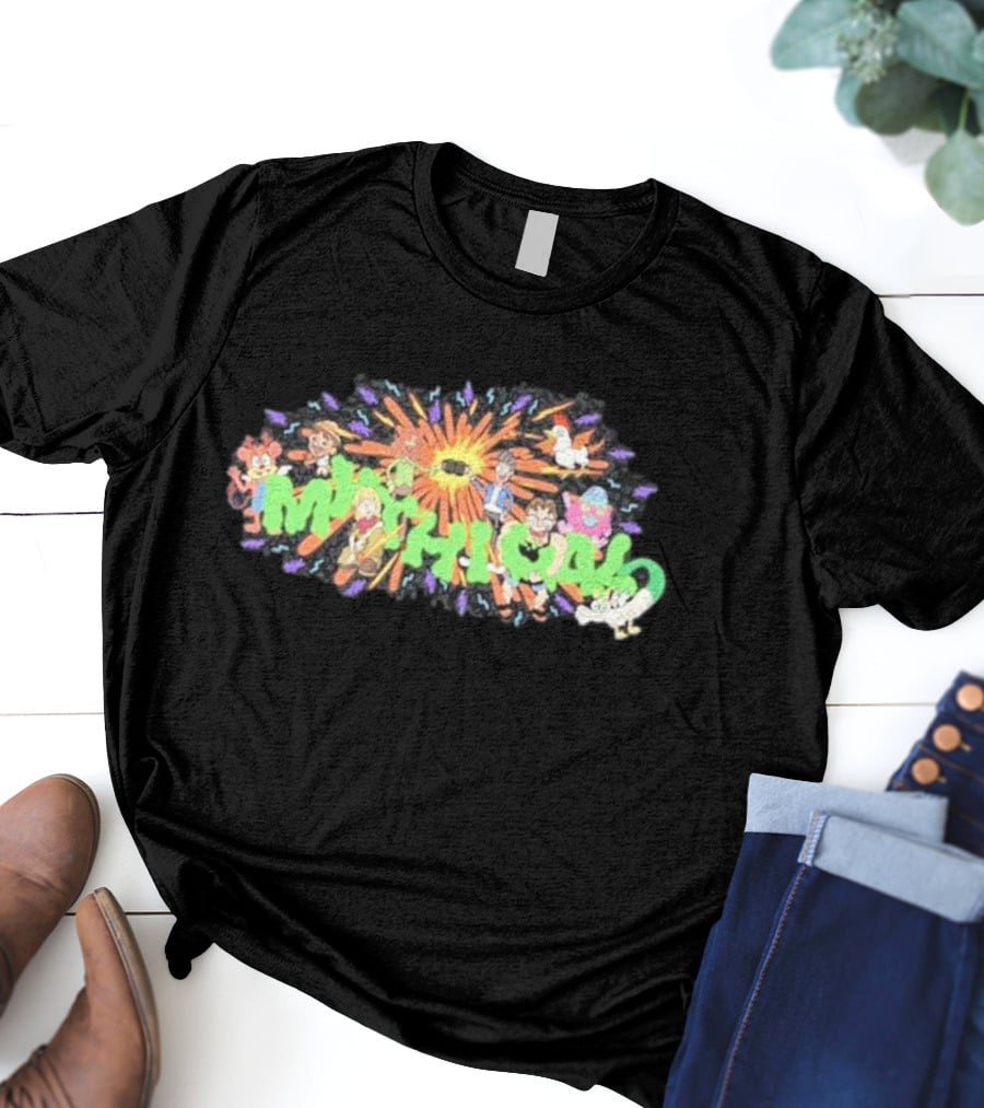 New Mythical ’90s Cartoon Characters Burst Mythical Explosion Shirt made from 100% pre-shrunk ring-spun cotton, unisex regular fit based on U.S. standard sizing. The shirt is designed, cut, sewn, and printed in the United States. Available in sizes S-5XL.