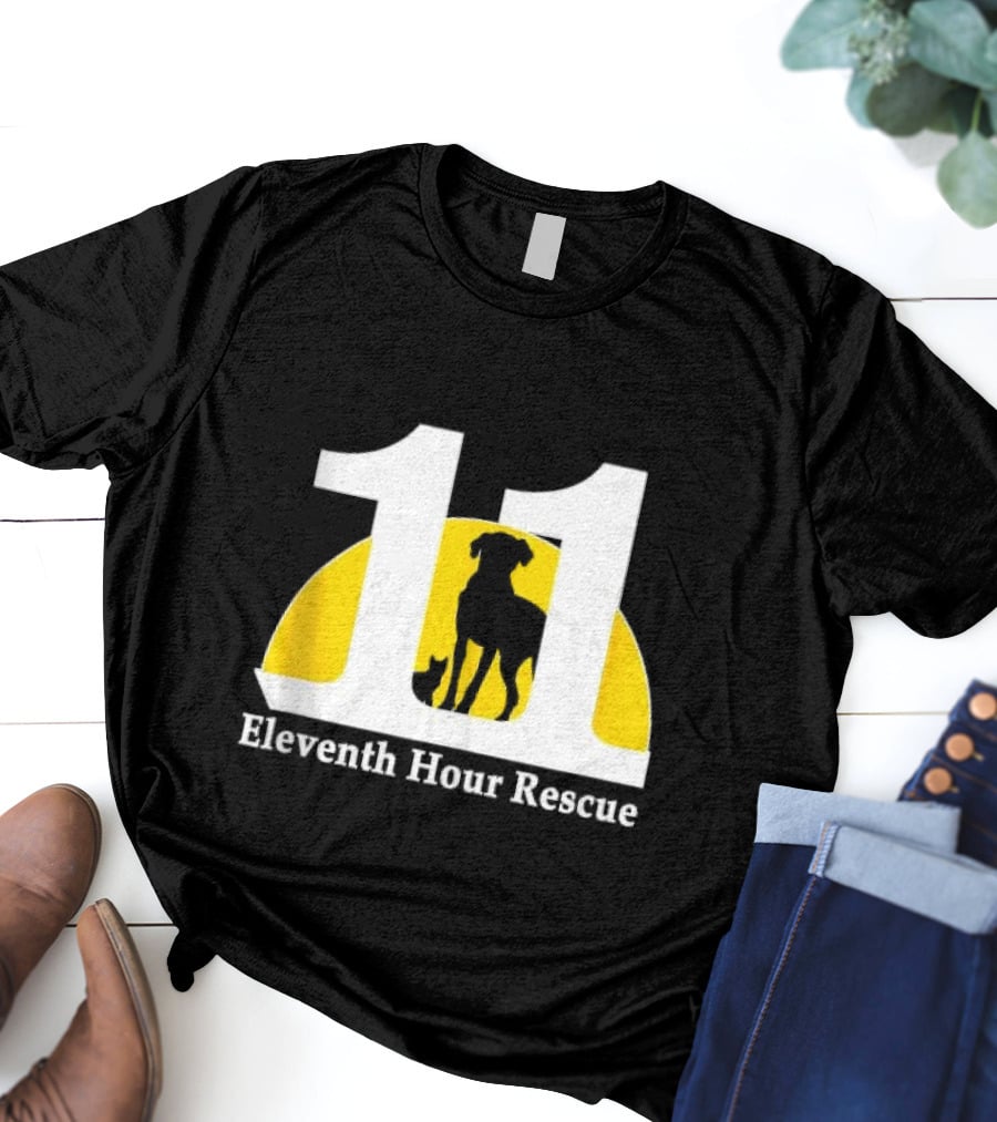 Eleventh Hour Rescue 11 Dog and Cat Silhouette in Yellow Circle Shirt made from 100% pre-shrunk ring-spun cotton, unisex regular fit based on U.S. standard sizing. The shirt is designed, cut, sewn, and printed in the United States. Available in sizes S-5XL.