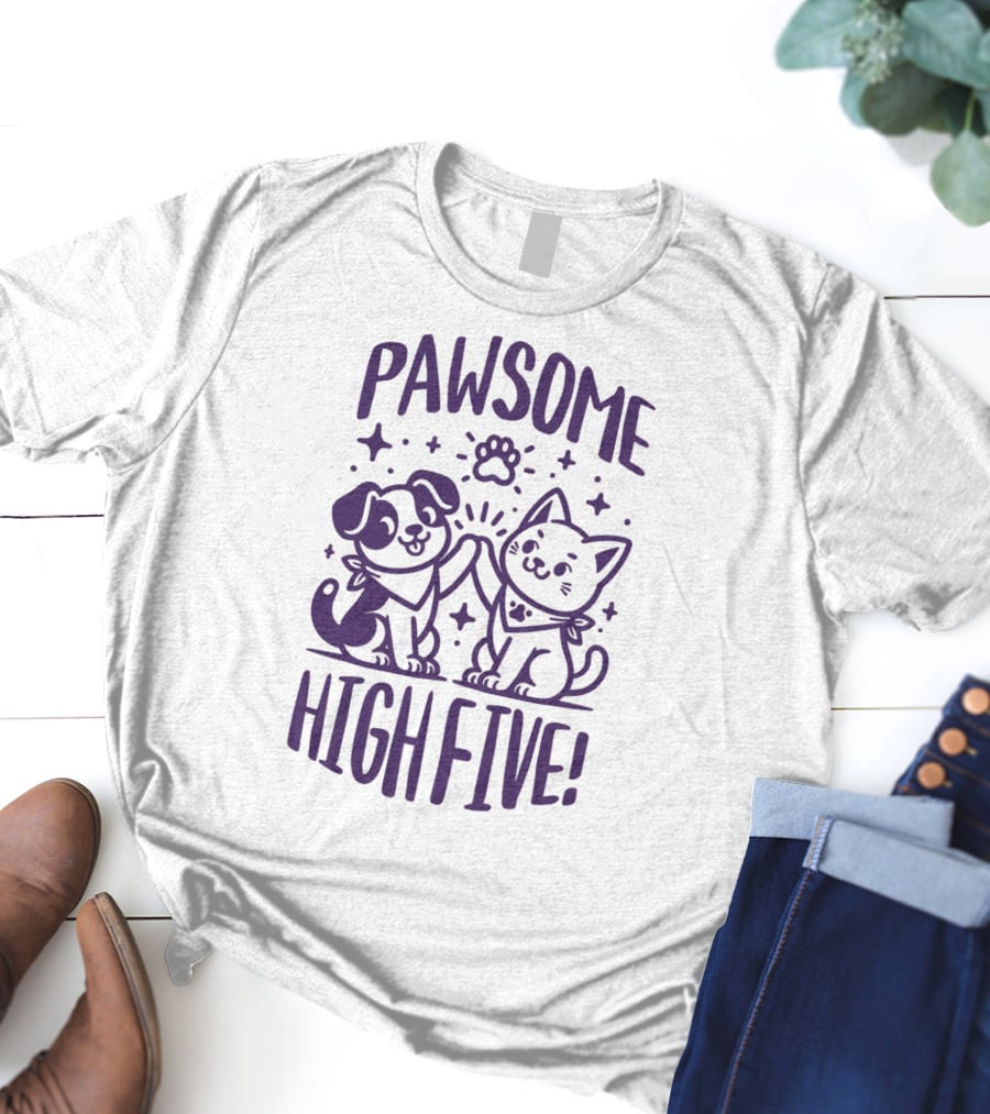 Pawsome High Five Cute Animal Purple Pawsom Shirt made from 100% pre-shrunk ring-spun cotton, unisex regular fit based on U.S. standard sizing. The shirt is designed, cut, sewn, and printed in the United States. Available in sizes S-5XL.