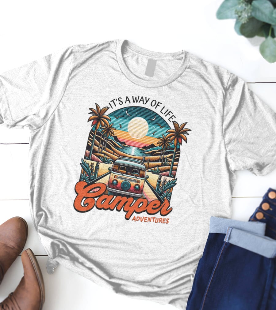 It's a Way of Life Camper Adventures Shirt made from 100% pre-shrunk ring-spun cotton, unisex regular fit based on U.S. standard sizing. The shirt is designed, cut, sewn, and printed in the United States. Available in sizes S-5XL.