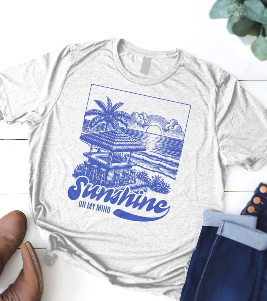 Sunshine On My Mind Vintage Beach Hut and Sunset Scene Shirt made from 100% pre-shrunk ring-spun cotton, unisex regular fit based on U.S. standard sizing. The shirt is designed, cut, sewn, and printed in the United States. Available in sizes S-5XL.