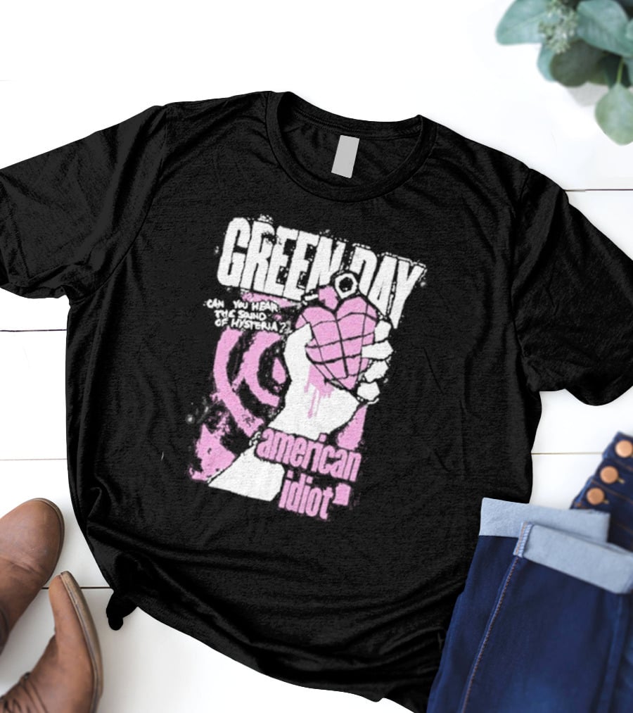 Green Day American Idiot Can You Hear The Sound Of Hysteria? Shirt made from 100% pre-shrunk ring-spun cotton, unisex regular fit based on U.S. standard sizing. The shirt is designed, cut, sewn, and printed in the United States. Available in sizes S-5XL.