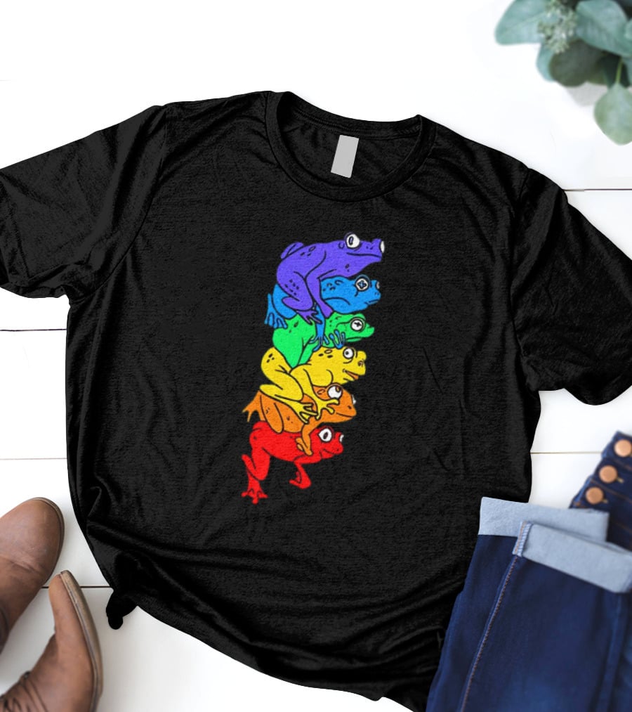 Rainbow Gay Frog Stack Shirt made from 100% pre-shrunk ring-spun cotton, unisex regular fit based on U.S. standard sizing. The shirt is designed, cut, sewn, and printed in the United States. Available in sizes S-5XL.