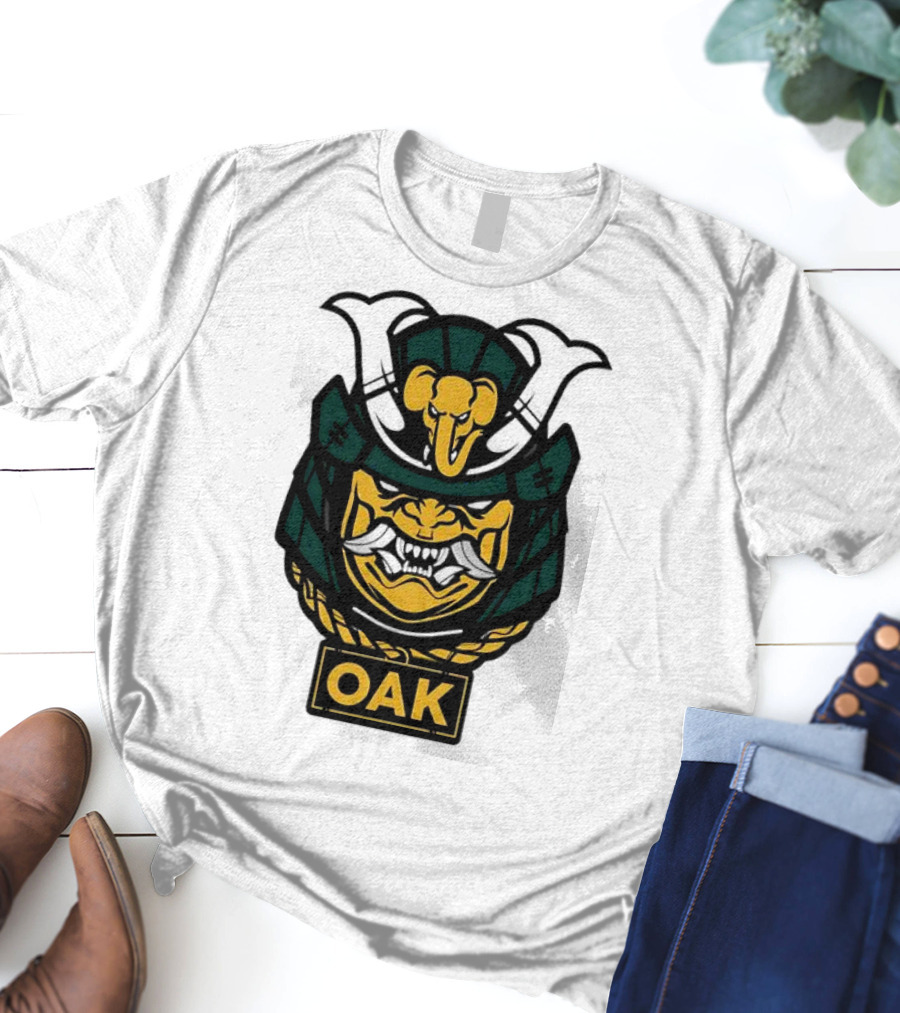 Oakland Athletics Samurai OAK Aggressive Mask Shirt made from 100% pre-shrunk ring-spun cotton, unisex regular fit based on U.S. standard sizing. The shirt is designed, cut, sewn, and printed in the United States. Available in sizes S-5XL.