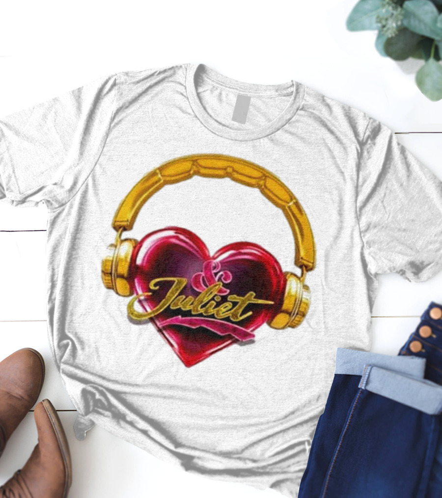 Broadway Juliet Heart Headphones Shirt made from 100% pre-shrunk ring-spun cotton, unisex regular fit based on U.S. standard sizing. The shirt is designed, cut, sewn, and printed in the United States. Available in sizes S-5XL.