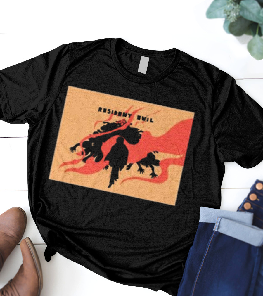 Resident Evil Silhouette Shadow Red Flames Shirt made from 100% pre-shrunk ring-spun cotton, unisex regular fit based on U.S. standard sizing. The shirt is designed, cut, sewn, and printed in the United States. Available in sizes S-5XL.