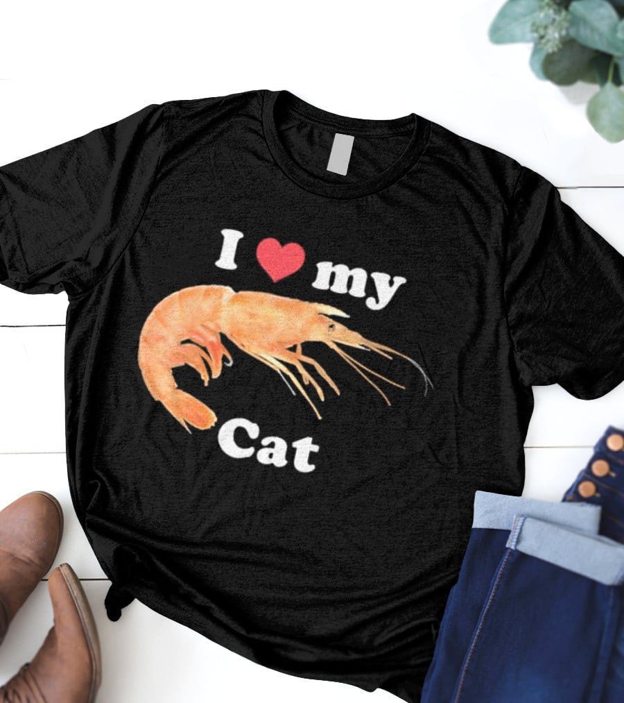 I Heart My Cat Shrimp Shirt made from 100% pre-shrunk ring-spun cotton, unisex regular fit based on U.S. standard sizing. The shirt is designed, cut, sewn, and printed in the United States. Available in sizes S-5XL.