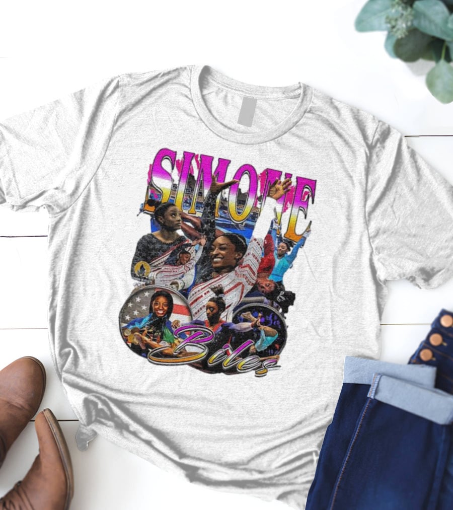 Simone Biles Olympic Champion Retro Collage Shirt made from 100% pre-shrunk ring-spun cotton, unisex regular fit based on U.S. standard sizing. The shirt is designed, cut, sewn, and printed in the United States. Available in sizes S-5XL.