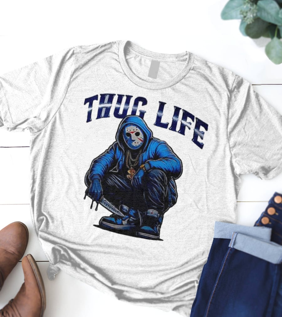 Thug Life Masked Man Sitting with Knife in Blue Hoodie and Sneakers Shirt made from 100% pre-shrunk ring-spun cotton, unisex regular fit based on U.S. standard sizing. The shirt is designed, cut, sewn, and printed in the United States. Available in sizes S-5XL.