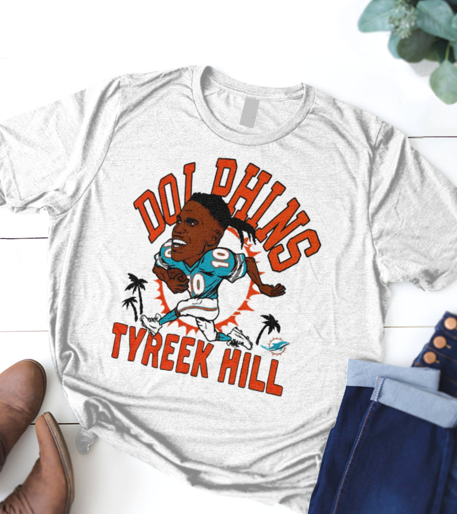 Tyreek Hill Miami Dolphins Caricature Player Signature Dolphins Shirt made from 100% pre-shrunk ring-spun cotton, unisex regular fit based on U.S. standard sizing. The shirt is designed, cut, sewn, and printed in the United States. Available in sizes S-5XL.