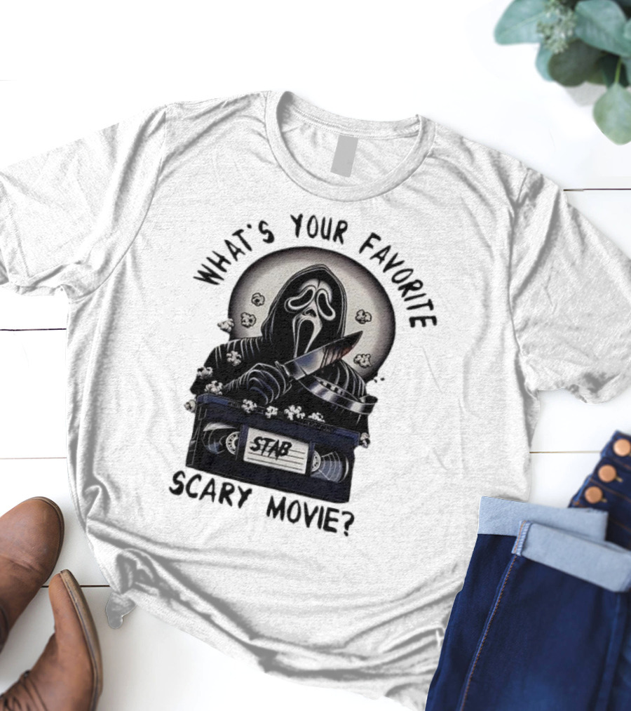 What's Your Favorite Scary Movie Ghostface Stab VHS Popcorn T-Shirt