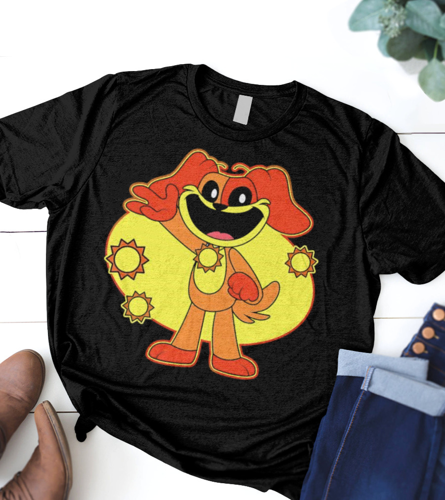 Dogday Smiling Critters Cheerful Cartoon Dog with Sun Icons Shirt made from 100% pre-shrunk ring-spun cotton, unisex regular fit based on U.S. standard sizing. The shirt is designed, cut, sewn, and printed in the United States. Available in sizes S-5XL.