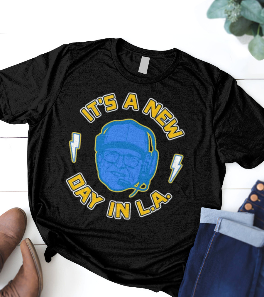 It's a New Day in L.A. Los Angeles Chargers Jim Harbaugh Shirt made from 100% pre-shrunk ring-spun cotton, unisex regular fit based on U.S. standard sizing. The shirt is designed, cut, sewn, and printed in the United States. Available in sizes S-5XL.