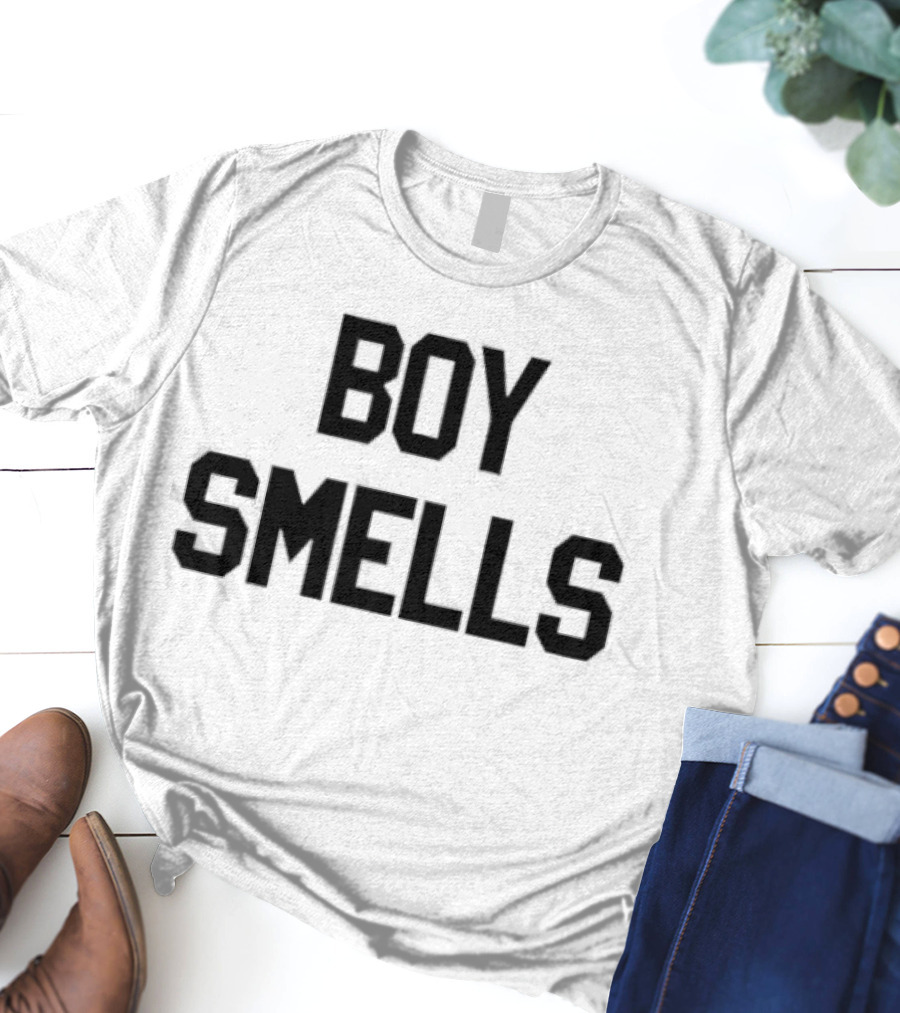 BOY SMELLS MERCH Shirt made from 100% pre-shrunk ring-spun cotton, unisex regular fit based on U.S. standard sizing. The shirt is designed, cut, sewn, and printed in the United States. Available in sizes S-5XL.