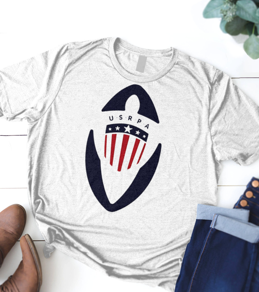 USRPA U.S. Rugby Players Association Red White and Blue Shield Shirt made from 100% pre-shrunk ring-spun cotton, unisex regular fit based on U.S. standard sizing. The shirt is designed, cut, sewn, and printed in the United States. Available in sizes S-5XL.