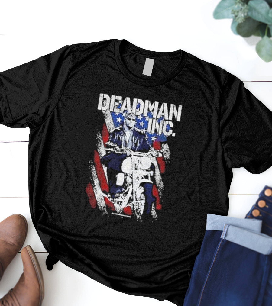 WWE Undertaker Deadman Inc American Flag Motorcycle Rider Shirt made from 100% pre-shrunk ring-spun cotton, unisex regular fit based on U.S. standard sizing. The shirt is designed, cut, sewn, and printed in the United States. Available in sizes S-5XL.